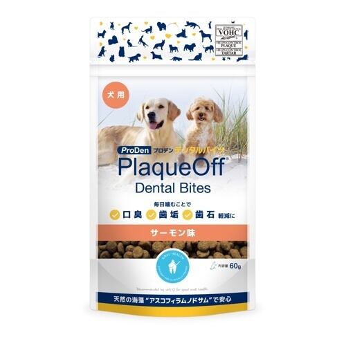プロデン デンタルバイツ サーモン味 犬用 60g 猫 日本全薬工業 PlaqueOff 歯磨きいらず 口臭予防 歯垢 歯石 デンタルケア 口腔ケア おやつ サプリメント 天然海藻 サーモンフレバー ドッグ いぬ オーラルケア ご褒美 JAN:4562312016071 | OTTO ANIMAL HEALTH|症状別カテゴリーでペットフード選びをシンプルに