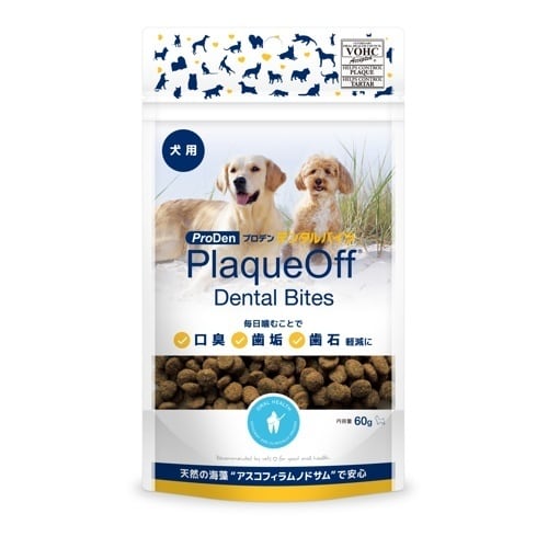 プロデン デンタルバイツ チキン味 犬用 60g 日本全薬工業 PlaqueOff 歯磨きいらず 口臭予防 歯垢 歯石 デンタルケア 口腔ケア おやつ サプリメント 天然海藻 ドッグ いぬ オーラルケア ご褒美 全犬種 JAN:4562312013605 | OTTO ANIMAL HEALTH|症状別カテゴリーでペットフード選びをシンプルに